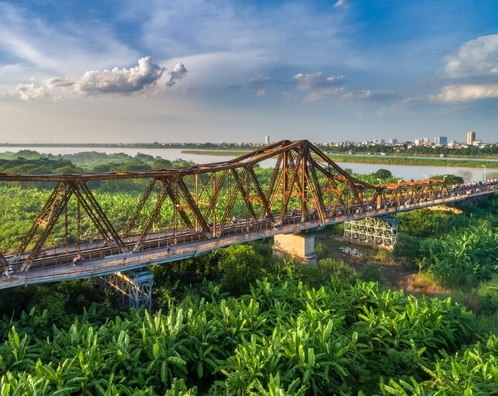 Jännittävän cycloretken jälkeen vuorossa on käynti historiallisella Long Bien -sillalla, joka rakennettiin 1900-luvun alussa ja on ikoninen maamerkki Ranskan siirtomaa-ajalta. Tämä tunnusomainen terässilta ylittää Punaisen joen, ja Vietnamin sodan aikana se vaurioitui pahasti, mutta nykyään se on Hanoihin sitkeyden ja sinnikkyyden symboli. Sillalla saavat kulkea vain junat, pyöräilijät ja jalankulkijat, ja tunnelma on ainutlaatuinen. Voit nähdä paikallisia pyöräilemässä töihin tai myymässä hedelmiä junaradan varrella sekä ihailla näkymiä vehreille jokisaarille ja viljelmille keskellä suurkaupunkia – suosittu kuvauskohde matkailijoille, jotka haluavat vangita Hanoin aidon tunnelman.