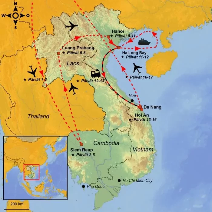 Sinut noudetaan hotelliltasi ja viedään Da Nangin lentokentälle, josta lennät välilaskujen kautta Suomeen. Jos olet varannut jatkomatkaksi rantaloman eksoottisella Phu Quocilla tai kaupunkiloman Ho Chi Minhin kaupungissa (Saigon) tai Huen keisarillisessa kaupungissa, jatkat Hoi Anista suoraan valitsemaasi kohteeseen.