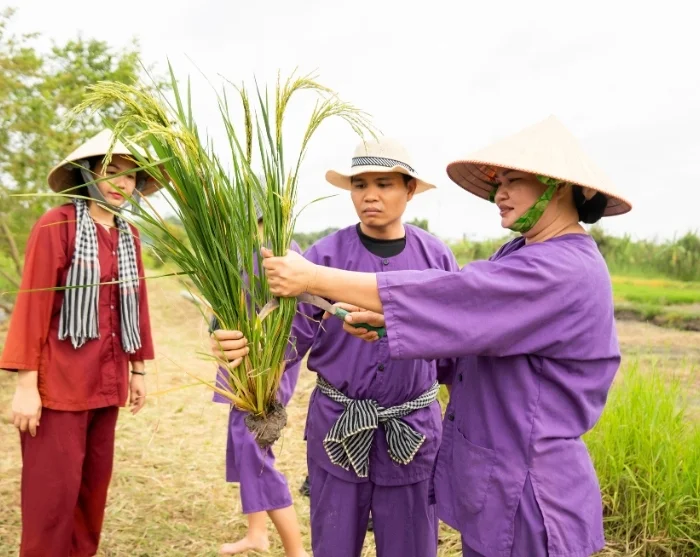 Seuraavaksi jatkat matkaa Vinh Longiin, jossa sijaitsee yhteistyökumppanimme käynnistämä kestävän kehityksen projekti. Täällä lähdet rauhalliselle kävelylle maalaiskylän läpi, jonka aikana opas kertoo sinulle tarkemmin projektista ja sen merkityksestä. Pääset myös itse kokeilemaan perinteistä maataloustyötä: voit osallistua riisiviljelyyn joko istuttamalla nuoria versoja tai auttamalla sadonkorjuussa, vuodenajasta riippuen. Tämä opettavainen ja aito kokemus tarjoaa ainutlaatuisen näköalan vietnamilaisen maaseudun arkeen ja siihen työhön, joka liittyy kestävään viljelyyn. Osallistumalla retkelle tuet samalla paikallisia perheitä Vinh Longissa, sillä osa matkan hinnasta menee suoraan projektin hyväksi. Voit tutustua tarkemmin projektiin täällä.