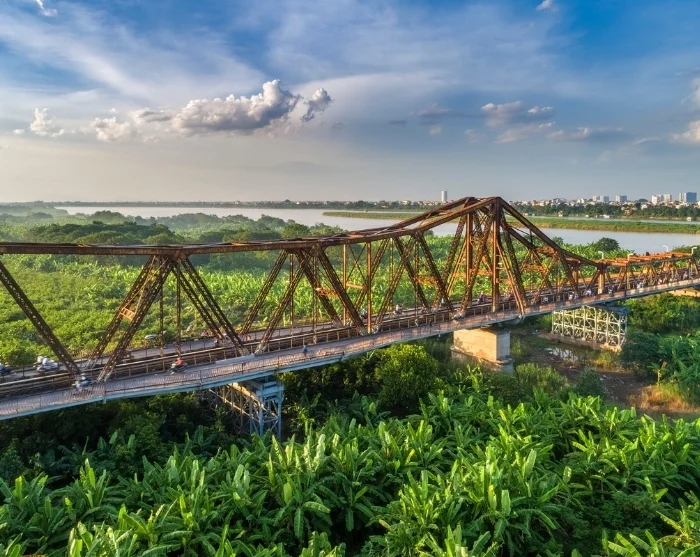 Jännittävän cycloretken jälkeen vuorossa on käynti historiallisella Long Bien -sillalla, joka rakennettiin 1900-luvun alussa ja on ikoninen maamerkki Ranskan siirtomaa-ajalta. Tämä tunnusomainen terässilta ylittää Punaisen joen, ja Vietnamin sodan aikana se vaurioitui pahasti, mutta nykyään se on Hanoihin sitkeyden ja sinnikkyyden symboli. Sillalla saavat kulkea vain junat, pyöräilijät ja jalankulkijat, ja tunnelma on ainutlaatuinen. Voit nähdä paikallisia pyöräilemässä töihin tai myymässä hedelmiä junaradan varrella sekä ihailla näkymiä vehreille jokisaarille ja viljelmille keskellä suurkaupunkia – suosittu kuvauskohde matkailijoille, jotka haluavat vangita Hanoin aidon tunnelman.