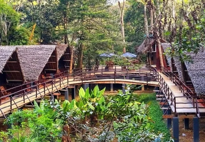Toisaalta majapaikka on ehdottomasti jo sinänsä vierailun arvoinen. Siellä on 28 bungalowia, jotka on varustettu hyttysverkolla, kattotuulettimella, tallelokerolla ja minibaarilla. Suuri vetonaula on sen sijainti sademetsän keskellä, ja etenkin ravintola, jossa on pienelle järvelle rakennettu terassi.