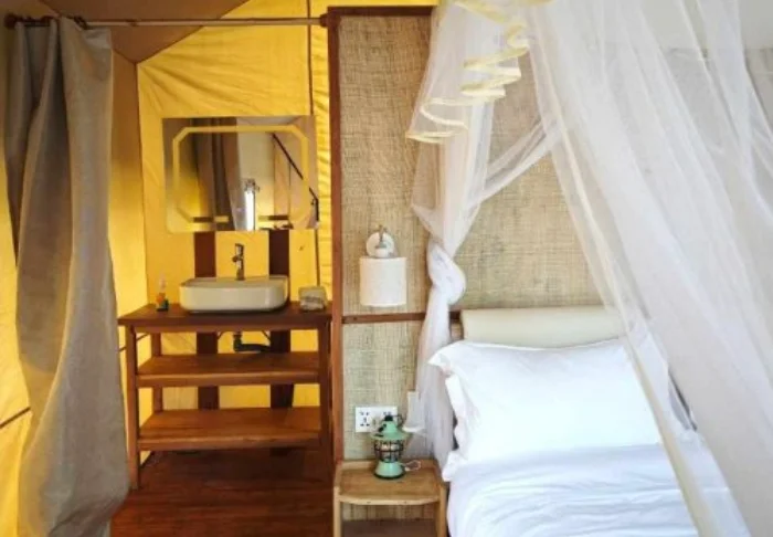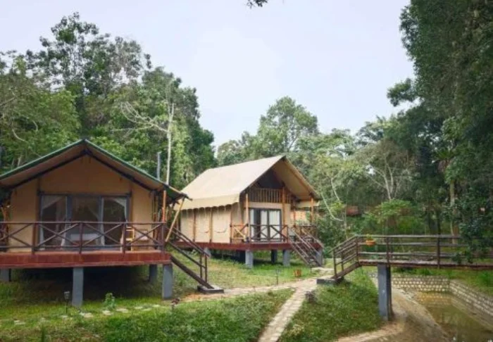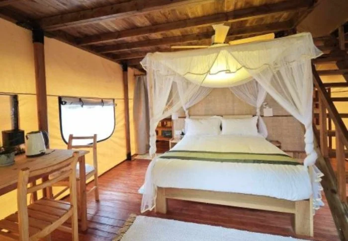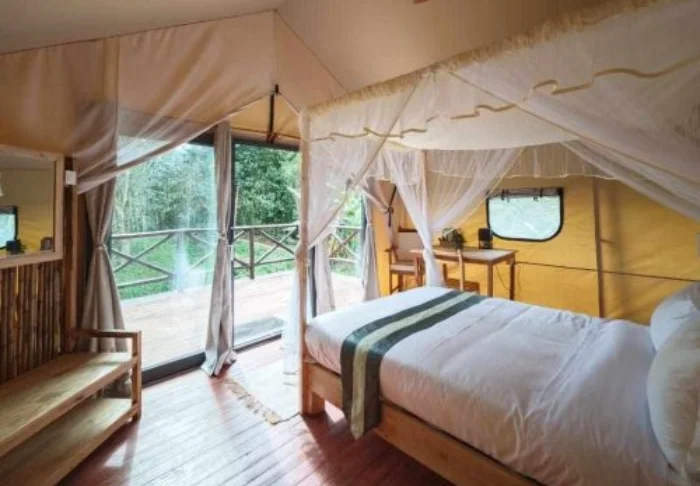 Osa huoneista sijaitsee bungaloweissa ja osa on luksustelttoja. Kaikki huoneet on sisustettu yksinkertaisesti mutta viihtyisästi, ja niissä on puisia yksityiskohtia, hyttysverkot ja pieni terassi, jossa on mukava istuskella kahvikupillisen äärellä ja kuunnella viidakon ääniä. Suihkussa on lämmin vesi, sähkö on käytettävissä suurimman osan vuorokaudesta ja WiFi on saatavilla yhteisissä tiloissa.