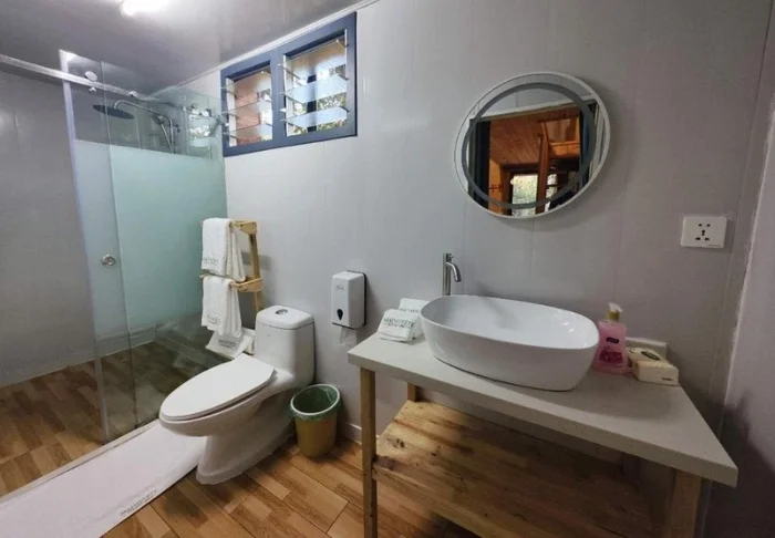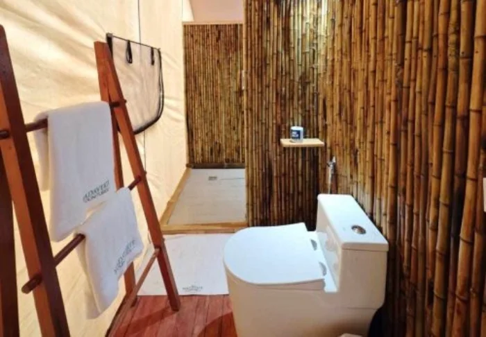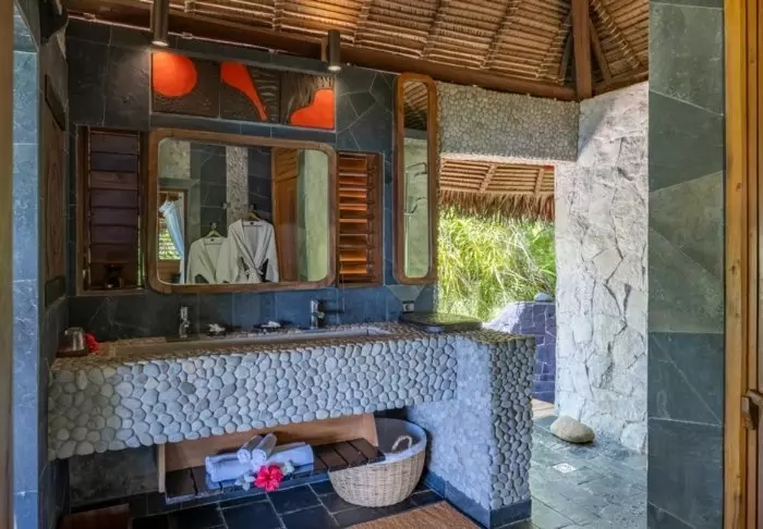 Kaikissa bungaloweissa on oma kylpyhuone ulkosuihkulla, joten täällä et ole koskaan kaukana luonnosta.