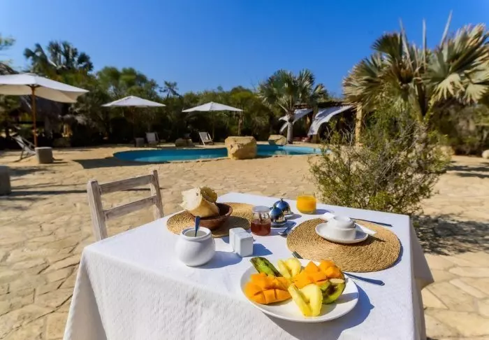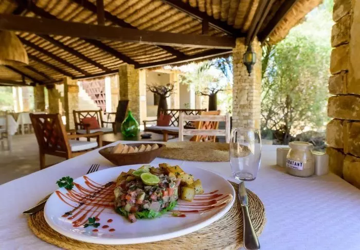 Hotellin ravintola tarjoaa mielenkiintoisen yhdistelmän eurooppalaisen ja madagaskarilaisen keittiön antimia. Voit aterioida ulkona terassilla auringon lämmössä tai nauttia drinkin tähtitaivaan alla. Aamiainen on elämys itsessään – tuoreita hedelmiä, kotitekoisia leivonnaisia, lämpimiä ruokalajeja ja vastakeitettyä kahvia.