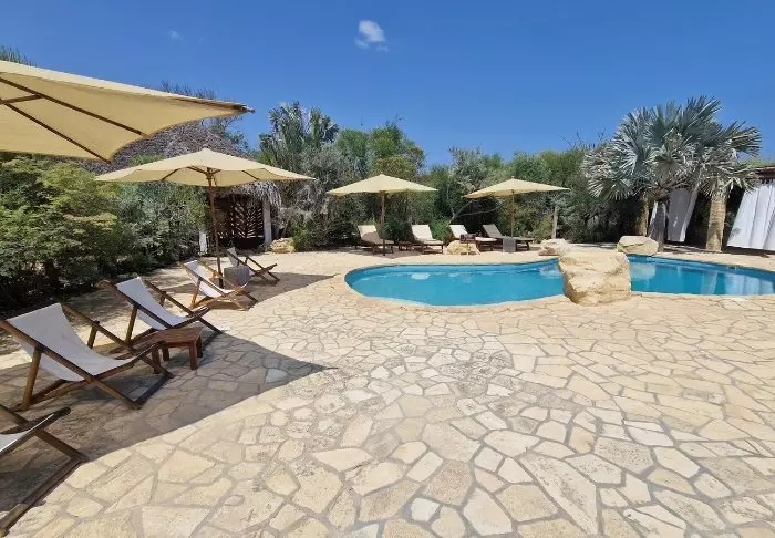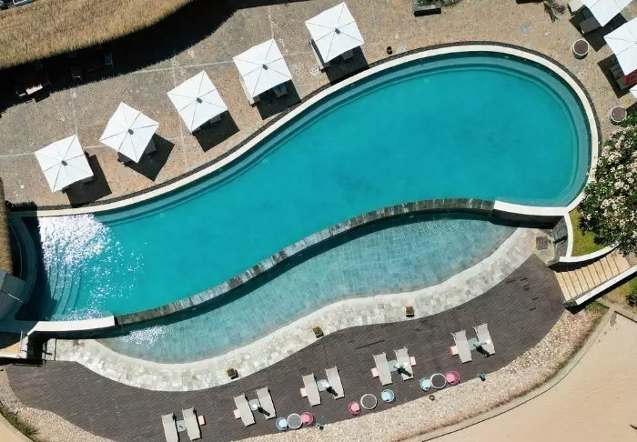 Uima-altaalta on näköala rannalle, ja altaan ympärillä on runsaasti tilaa aurinkotuoleille, jotka kutsuvat viettämään rauhallisen päivän hyvän kirjan parissa ja pulahtamaan välillä viileään veteen. Itse ranta on leveä ja rauhallinen – ja sopii täydellisesti kävelyyn lämpimässä hiekassa.