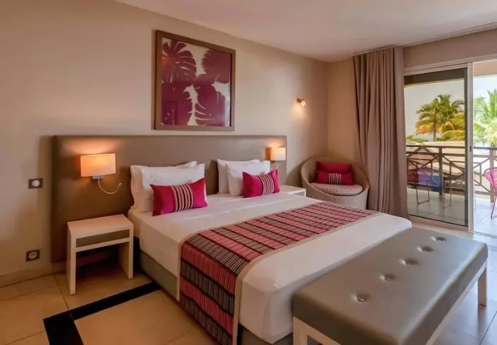 Vaikka Nosy Manga on lentokenttähotelli, se on uskomattoman viehättävä. Huoneita on 33, ja ne on kaikki sisustettu eri tavoin; seinillä on taidetta, ja tyynyt antavat ripauksen iloista väriä.