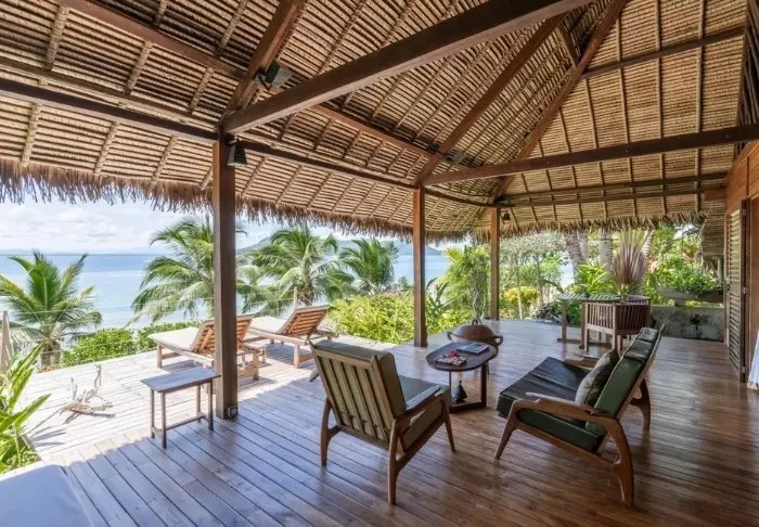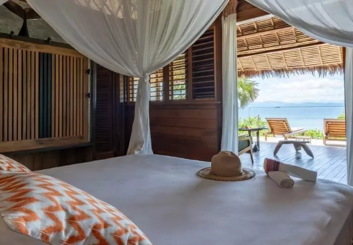 Bungalowit on rakennettu kivestä, ja niissä on olkikatot ja ruusupuupalkit. Kauniit, lämpimät puulattiat toivottavat sinut tervetulleeksi sisätiloihin, joissa seinät on sisustettu tyylikkäästi paikallisella taiteella ja käsitöillä. Juuri tarpeeksi – mutta ei niin paljon, että se häiritsisi suurista ikkunoista avautuvaa näköalaa. Majapaikan rantasijainnin ansiosta kaikista bungaloweista on näköala rannalle. Voit nauttia siitä myös omalta terassiltasi, jossa on pari aurinkotuolia, jotka odottavat käyttöä.
