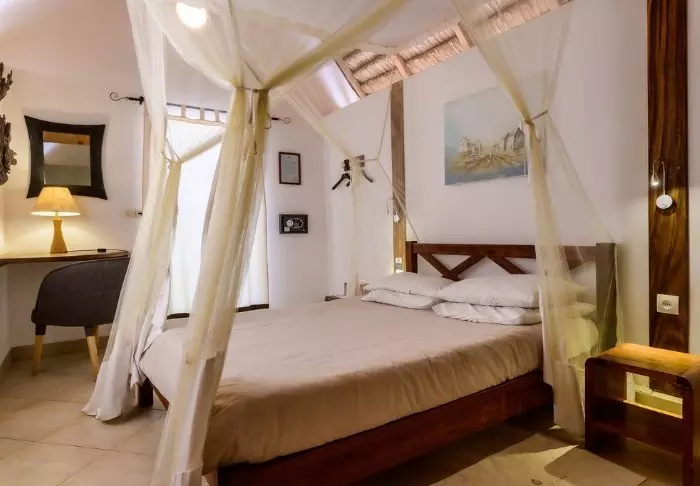 Bungalowit on sisustettu erittäin viehättävästi perinteiseen madagaskarilaiseen tyyliin: melko yksinkertaisesti, mutta siististi ja kauniisti, ja lähes kaikki on valmistettu kauniista, kultaisesta puusta. Jokaisella bungalowilla on oma terassi, jossa on kaksi lepotuolia. Täällä on helppo viettää päivä vain istuskellen, rentoutuen ja kirjaa lukien.