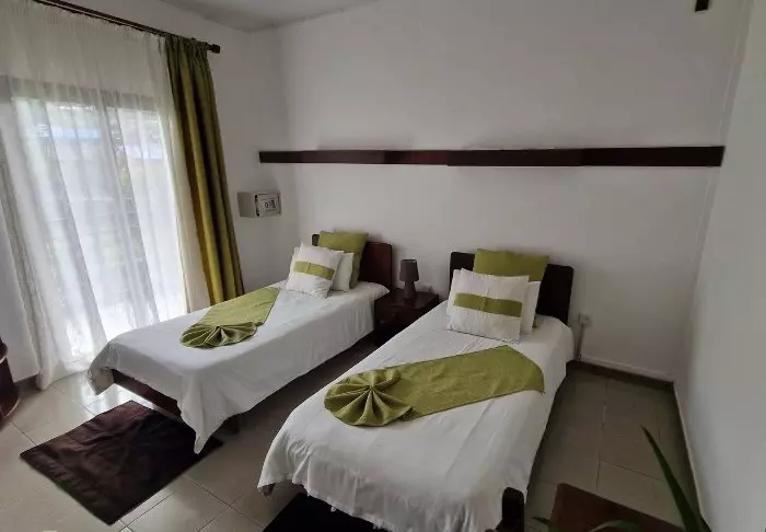 Hotellin 18 huonetta on suhteellisen yksinkertaisesti kalustettu rustiikkisilla kalusteilla ja niissä on runsaasti tilaa matkatavaroille. Kaikissa huoneissa on tietenkin oma kylpyhuone (vaikkakin vanha), tuuletin ja hyttysverkko sänkyjen yläpuolella.