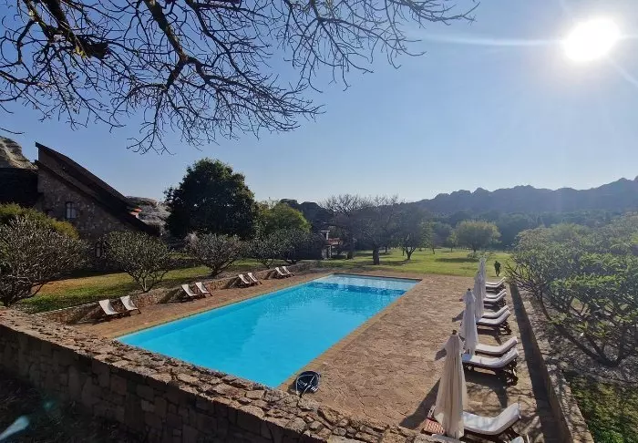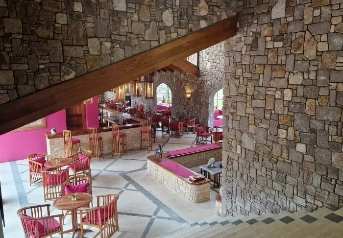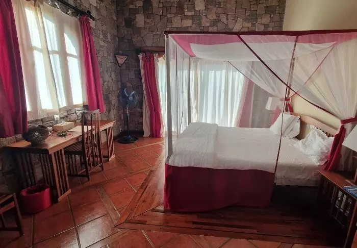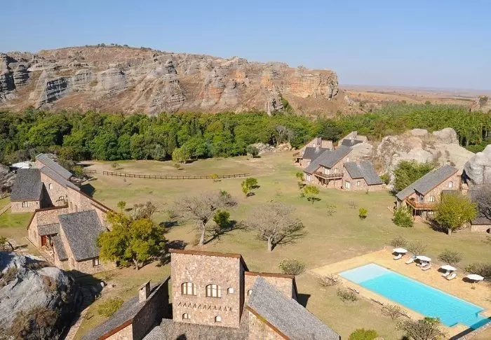 Hotellissa on 40 huonetta, ja se on rakennettu graniitista niin, että se sulautuu ympäristöönsä mahdollisimman hyvin. Huoneet on rakennettu suuren keskusnurmikon ympärille, jonka toisessa päässä on hiekkakiviä. Täällä on runsaasti valoa ja raikasta ilmaa, ja tunnet olevasi lähellä luontoa.