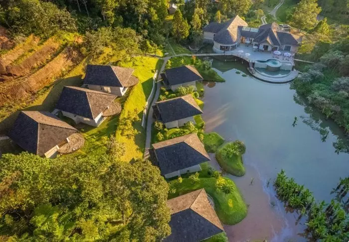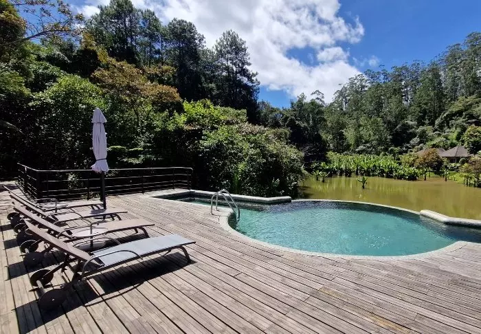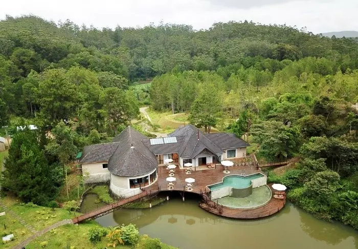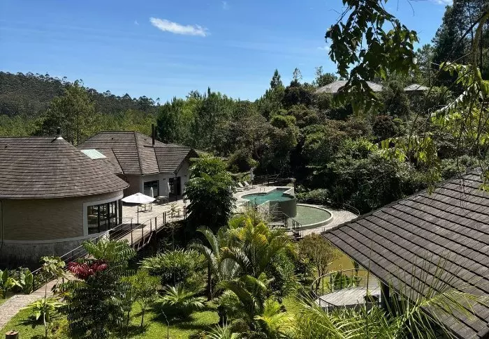 Kymmenen kaunista bungalowia keskellä yksityistä puistoa, vain kivenheiton päässä Andasibe-Mantadian kansallispuistosta – tämä on Manjarano Lodge & Spa.