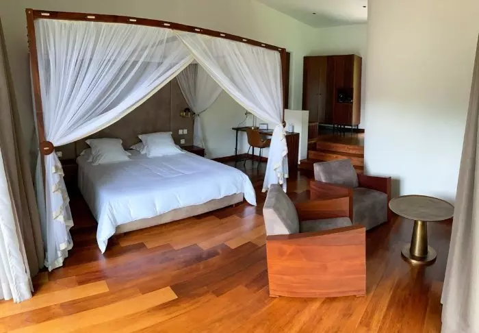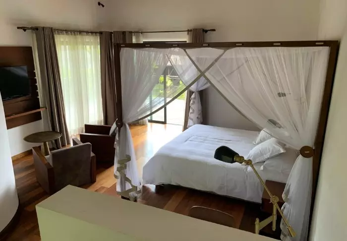 Bungalowit ovat todellakin jotain! Niissä on kylpyhuone, jossa on jalallinen kylpyamme, oma parveke, josta on näkymät järven yli, teen- ja kahvinkeittomahdollisuus, upea puuvillaiset liinavaatteet, minibaari ja WiFi (mikä voi olla Madagaskarin tapaan hieman epävakaa). Bungalowit ovat kahdessa tasossa, ja niissä on tilaa sekä vuoteelle että pienelle rentoutumisalueelle. Ne on sisustettu neutraaleilla väreillä.