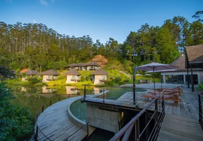 Yleisillä alueilla on kaunis ravintola ja baari sekä ihastuttava aurinkoterassi äärettömällä uima-altaalla, josta avautuu näkymä pienelle järvelle.