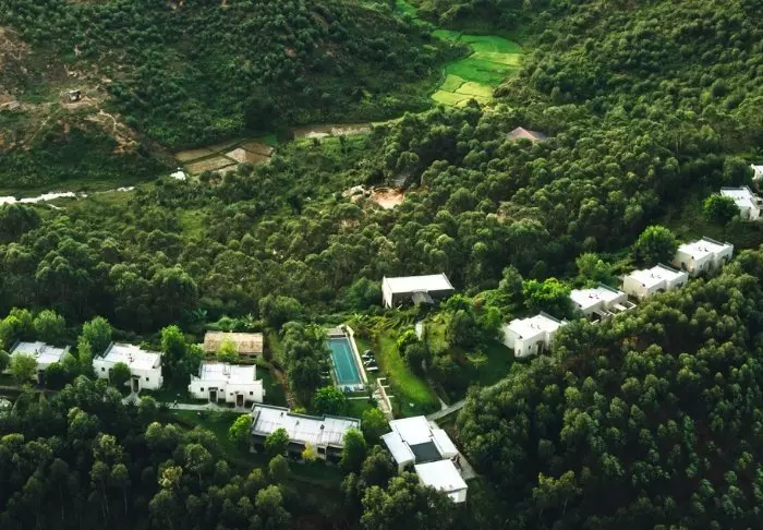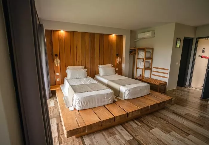 Hotellin 23 tilavaa huonetta on sisustettu ympäröivää luontoa kunnioittaen. Huoneissa on puulattiat ja hillityt värit, ja suihkusta voit ihailla ympäröivää metsää. Kylpyhuoneissa on myös ympäristöystävällistä saippuaa ja shampoota, ja kaikki ylimääräinen vesi kerätään ja suodatetaan ennen kuin sitä käytetään uudelleen kukkivan puutarhan kastelemiseen ulkona.
