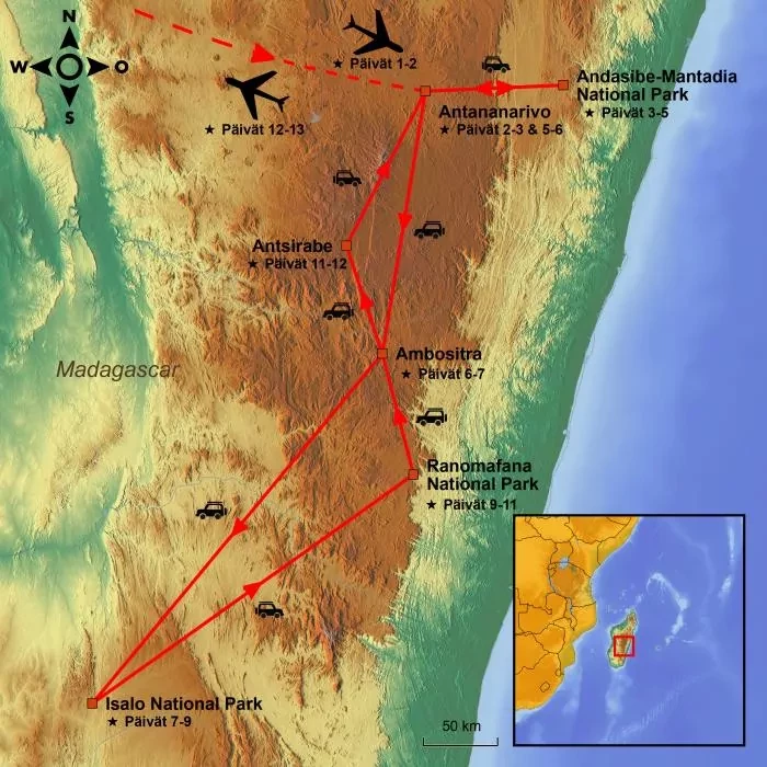 Ajo jatkuu pohjoiseen, ja tämän päivän matkakohde on viehättävä Antsiraben kaupunki, jonka läpi ajoit matkalla Tanasta kohti Ambositraa. Matka kestää 4 tuntia. Huomaa jälleen, miten maisemat muuttuvat dramaattisesti suhteellisen lyhyellä etäisyydellä – sademetsistä ylämaille erottuvine riispeltoineen.