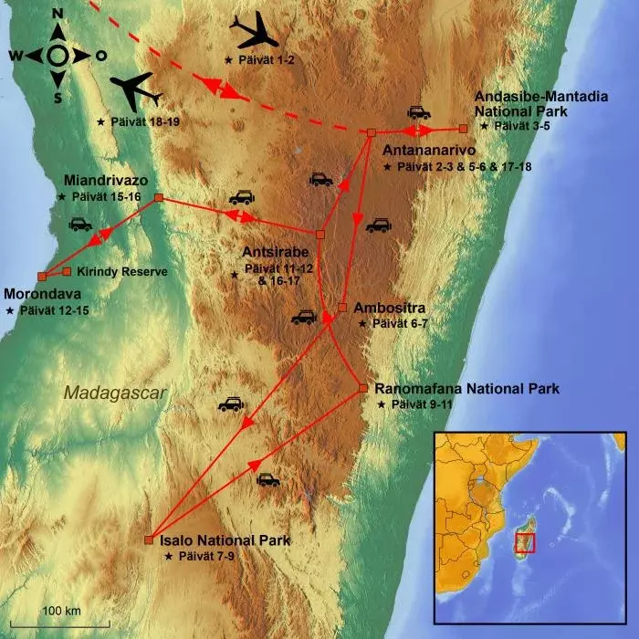 Matka alkaa tänään valitulta lentokentältä. Matkalla on välilasku/ja. Suuntaat kohti mahtavaa Madagaskaria, Intian valtameren isoa punaista saarta.