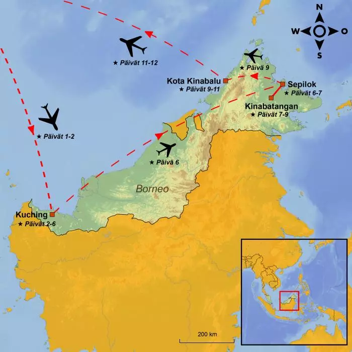 Tänään otat ensimmäiset askeleesi seikkailulla, joka vie sinut Borneolle. Lennät valitsemaltasi lentokentältä välilaskun/-laskujen kautta.