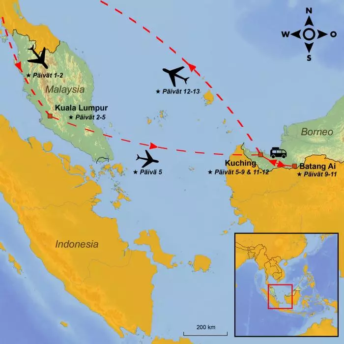 Tänään otat ensimmäiset askeleesi seikkailulla, joka vie sinut Kuala Lumpuriin ja Borneolle. Lennät valitsemaltasi lentokentältä välilaskun/-laskujen kautta.