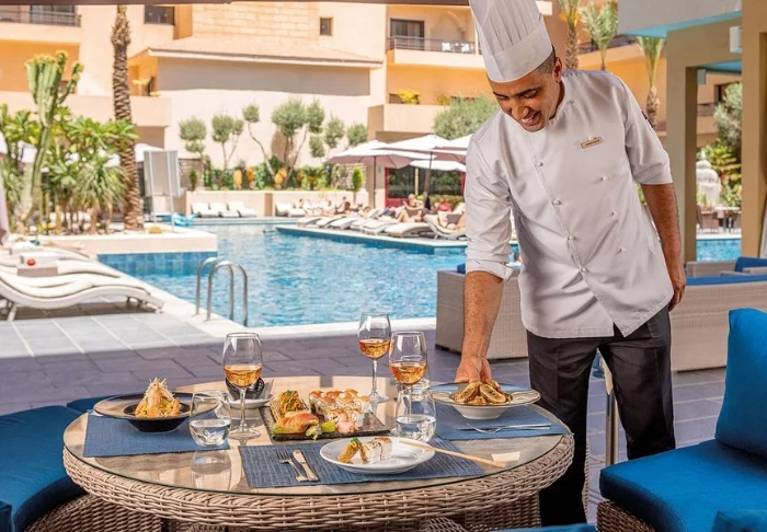 Aamiainen tarjoillaan usein hotellin uima-altaalla, joka on luonnollinen kokoontumispaikka keskellä kompleksia, tai sisällä ravintolassa. Päivän aikana allasbaarissa on tarjolla juomia ja kevyitä välipaloja, ja hotellin aulan yhteydessä on myös varsinainen baari.