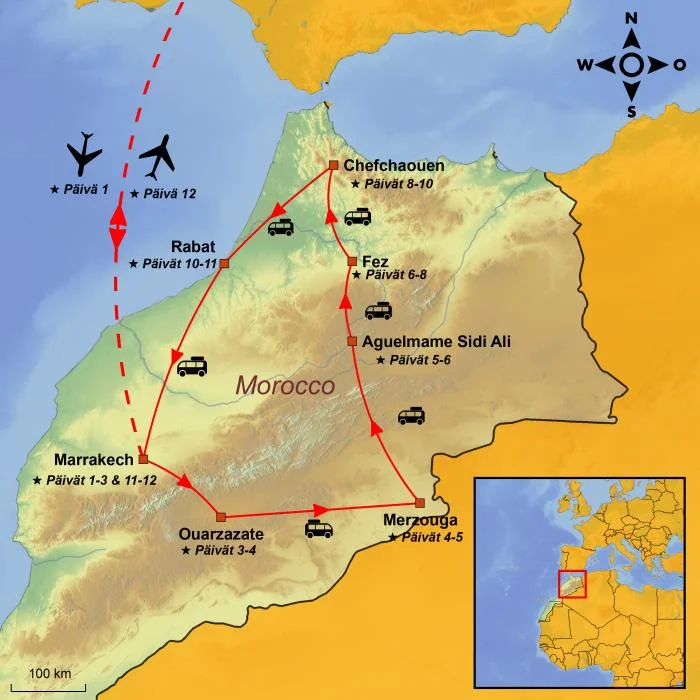 Matkan varrella vierailet myös roomalaisilla raunioilla Volubiliksessa, ja kuljet Rif-vuorten halki hurmaavaan siniseen Chefchaouenin kaupunkiin. Kierros päättyy Marokon tyylikkääseen pääkaupunkiin Rabatiin ja moderniin Casablancaan, jossa pääset ihailemaan vaikuttavaa Hassan II- moskeijaa.