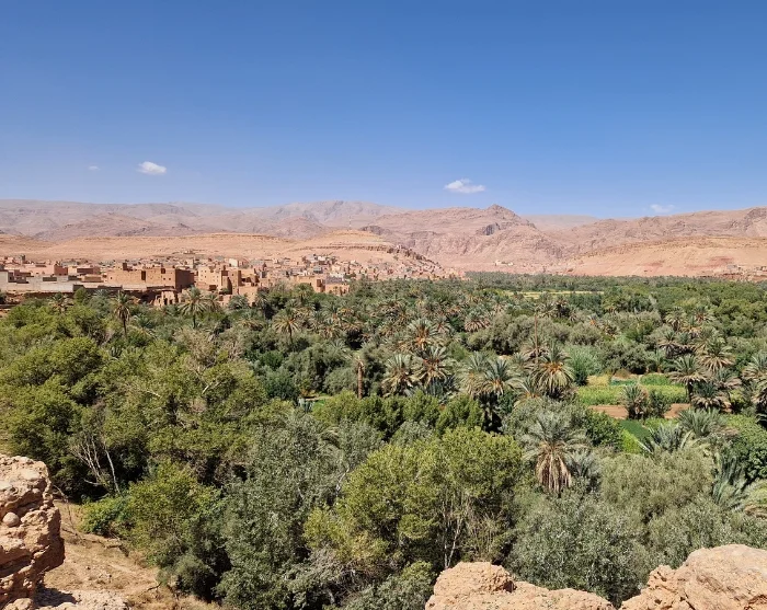Tämän jälkeen matka jatkuu vaikuttavan kivikkoisen ja karun maaston halki. Yhtäkkiä maisema muuttuu täysin: keskelle kuivuutta ilmaantuu vehreä keidas. Laaksossa avautuu vihreiden palmujen, pienien viljelysten ja kastelukanavien verkosto. Ensimmäisenä saavut Skouraan, jossa muinaiset kasbaht ja savesta rakennetut talot piileskelevät palmujen lomassa.