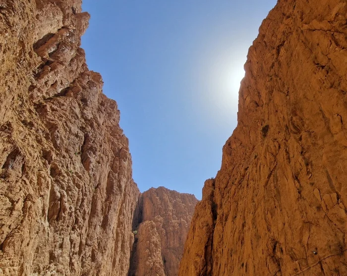 Lopulta, kun lähestyt Tinghirin kaupunkia, laakso kapenee ja joki katoaa lähes kokonaan korkeiden kallioseinämiensä väliin. Täällä Todghin rotko avautuu, ja tie kulkee kapean laakson pohjaa pitkin, jonne auringonvalo yltää vain muutamaksi tunniksi päivän aikana. Jätät auton ja jatkat viimeisen osuuden matkaa kävellen syvälle rotkon uumeniin. Kirkas vesi virtaa joessa tien vierellä, ja kuumana päivänä varpaat tekisi mieli kastaa siihen.