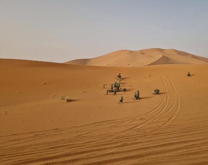 Mitä lähemmäs Merzougaa saavut, sitä voimakkaammin aavikko tulee esiin. Palmut ja keitaat katoavat, ja hiekkadyynit ilmestyvät horisonttiin. Lopulta suuret Erg Chebbin dyynit kohoavat edessäsi: korkeat, aaltoilevat hiekkavuoret, jotka hehkuvat oranssin eri sävyissä auringonlaskun aikaan.