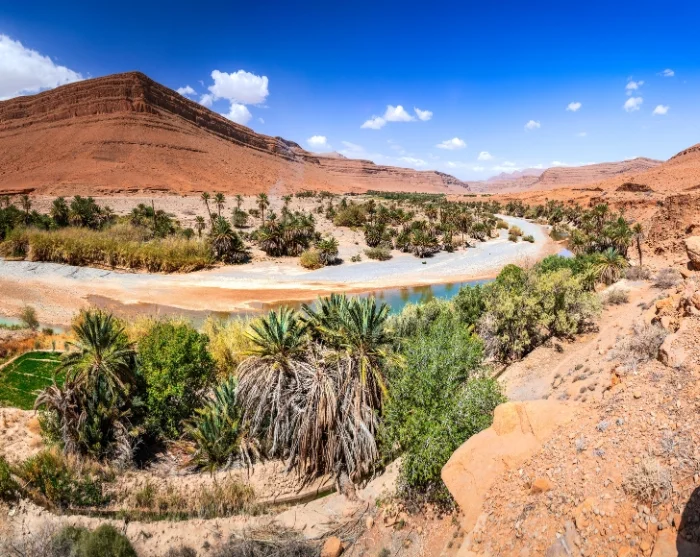 Kun jatkat matkaa itään, laakson pohja levenee ja vihreä kasvillisuus harvenee. Täällä huomaa selvästi, miten Saharan autiomaa ottaa vallan. Hiekka hallitsee maisemaa yhä näkyvämmin, ja alue on tunnettu fossiileistaan ja perinteisistä kivirakennuksistaan.
