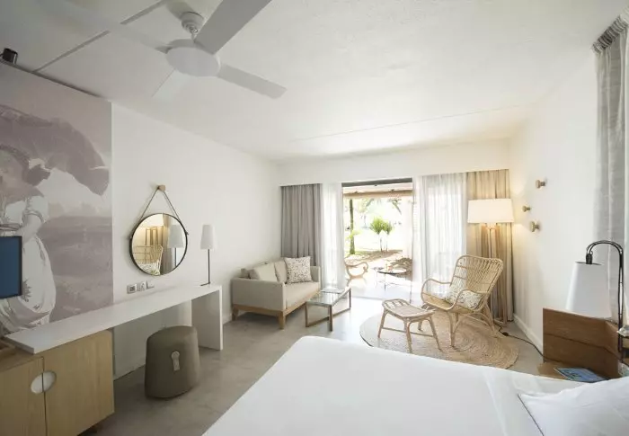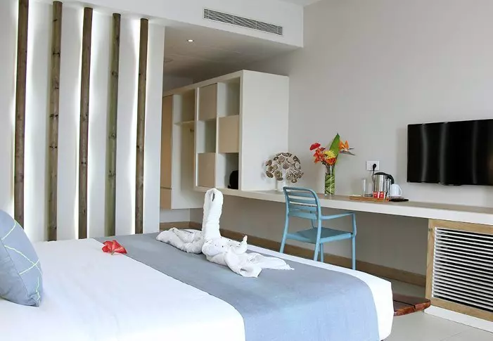 Eteläsiiven Prestige-huoneet on sisustettu värikkäästi ja persoonallisesti, kun taas pohjoissiiven hieman suuremmat Deluxe-huoneet ovat hieman hillitympiä ja ylellisempiä. All-inclusive-konseptiin kuuluu huoneessa minibaari, joka täytetään päivittäin oluella, virvoitusjuomilla ja viinillä (haluttaessa) kaikkien päivän aterioiden lisäksi. Myös ruokarintamalla oleva C Mauritius erottuu joukosta (positiivisesti, jos meiltä kysytään), sillä esimerkiksi lounasaikaan voit noutaa ruokasi ja kylmän oluen hotellin itsepalveluravintolassa ja viedä sen rannalle tai nauttia siitä parvekkeella ilman, että sinun tarvitsee vaihtaa vaatteita ja odottaa tarjoilijaa – ellet tietysti halua tehdä sitä, koska sekin on vaihtoehto!