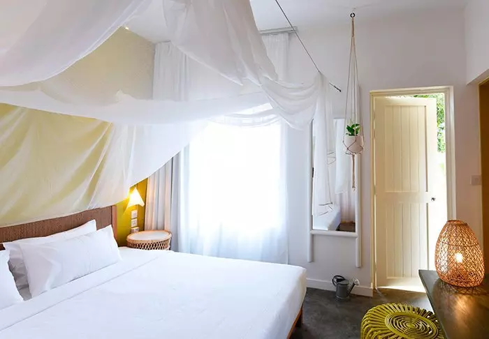 Huoneet sijaitsevat isossa vehreässä puutarhassa, jonka toisesta päästä alkaa varsinainen hiekkaranta.