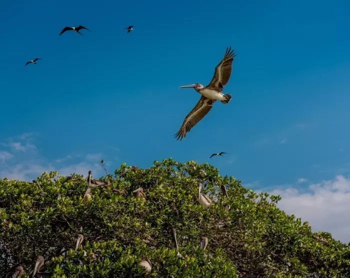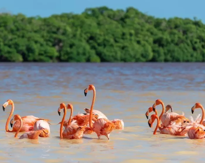 Saavuttuasi Celestuniin lähdet ensin veneretkelle kansallispuistoon, joka tunnetaan mangroveistaan ja vaikuttavasta linnustostaan. Suurimman osan vuodesta voit nähdä kokonaisia parvia kauniin vaaleanpunaisia flamingoja, jotka monien muiden eksoottisten lintujen ohella pitävät puistoa kotinaan. Villieläimiä on Celestunissa yleensä runsaasti, joten pidä silmäsi auki – saatat jopa nähdä krokotiilin matkan varrella. Veneretki kestää noin puolitoista tuntia, ja sen aikana opas kertoo paljon mielenkiintoista tietoa alueesta.