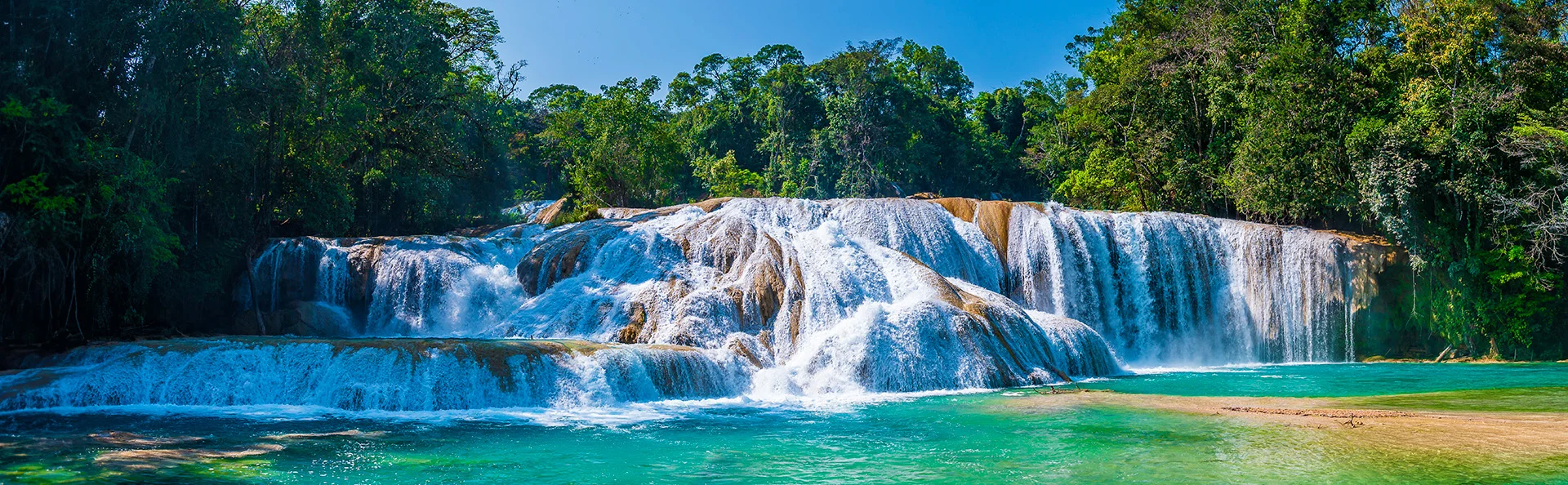Ensimmäinen pysähdys on Agua Azulin putouksilla (Siniset putoukset), jotka muodostavat sarjan kuohuavia vesiputouksia, joissa turkoosi vesi virtaa valkoisten kalkkikiviterassien yli eri tasoissa. Veden ominaisväri johtuu korkeasta mineraali- ja kalkkipitoisuudesta, jotka heijastavat auringonvaloa ja luovat lähes satumaisen maiseman. Putoukset sijaitsevat rehevän sademetsän keskellä, ja joen varrelle muodostuu pieniä luonnonaltaita, joissa voit virkistäytyä.