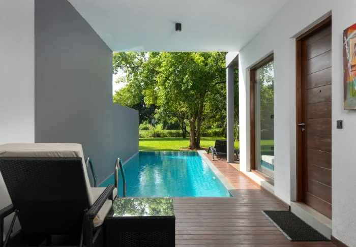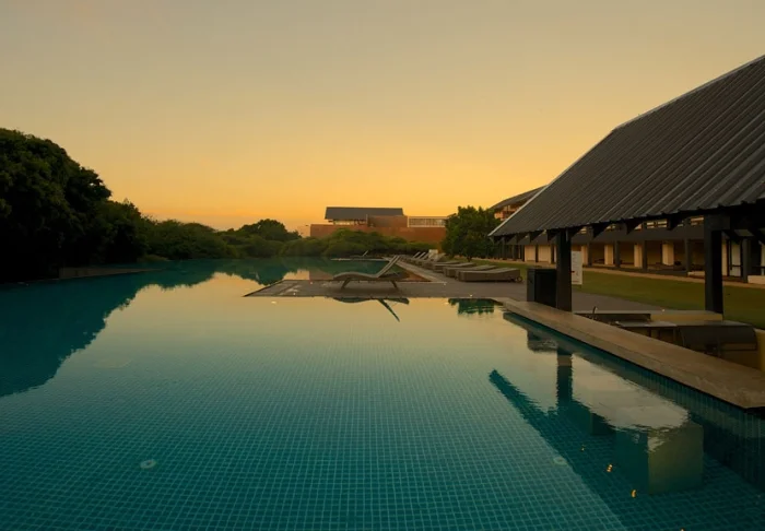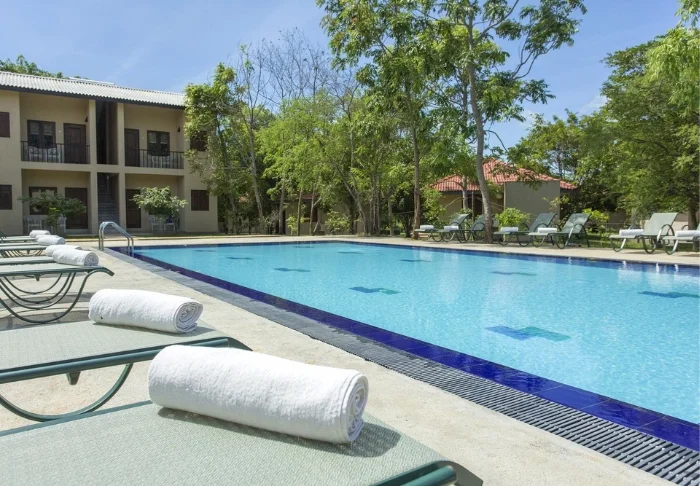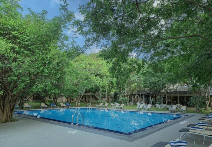 Rajarata Hotelin vehreässä puutarhassa sijaitsee myös hotellin uima-allasalue, jossa vallitsee erityisen rauhallinen tunnelma. Täällä voit rentoutua aurinkotuolissa, virkistäytyä vedessä tai nauttia auringon lämmöstä kokemusrikkaan temppelipäivän jälkeen.