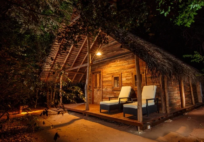 Huoneita on yhteensä 55, ja jokainen niistä on kooltaan vähintään 52 m2. Kaikissa huoneissa on oma terassi, josta avautuu näköala kauniisti maisemoituun puutarhaan. Kasvillisuuden lomassa visertävät muuttolinnut ja monet paikalliset lintulajit. Huoneet on kalustettu tummilla puukalusteilla, värikkäillä tekstiileillä ja hienoilla paperilyhdyillä. Mukavuuksiin kuuluvat ilmastointi, kattotuuletin, Wi-Fi, televisio, puhelin, tallelokero, oleskelualue ja kirjoituspöytä. Lisäksi huoneessa on vedenkeitin, joten voit keittää helposti kupillisen kahvia tai teetä ja nauttia sen omalla terassillasi. Kylpyhuoneessa on sadesuihku, hiustenkuivaaja ja ilmaisia kylpytuotteita.