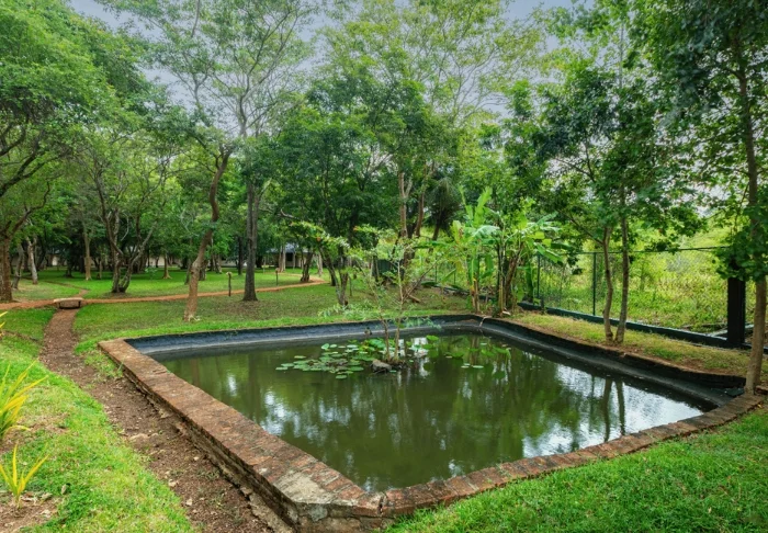 Grand Udawalawe Safari Resortissa majoitut keskellä luontoa, vehreiden puiden ja pienten lampien ympäröimänä, joissa oranssit karpit uiskentelevat vedessä. Täällä rauha vallitsee, kutsuen sinut rentoutumaan ja nauttimaan rehevästä ympäristöstä.