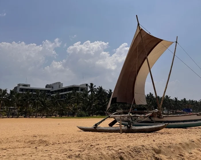 Lentokentältä matka jatkuu kohti Negomboa, eloisaa rannikkokaupunkia, jonne on vain puolen tunnin ajomatka. Edessä avautuu leveä, kullankeltainen hiekkaranta, jonka palmut heiluvat lempeässä tuulessa ja värikkäät kalastajaveneet lipuvat rauhallisesti rantaan.