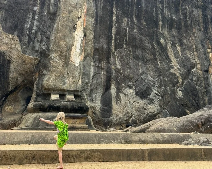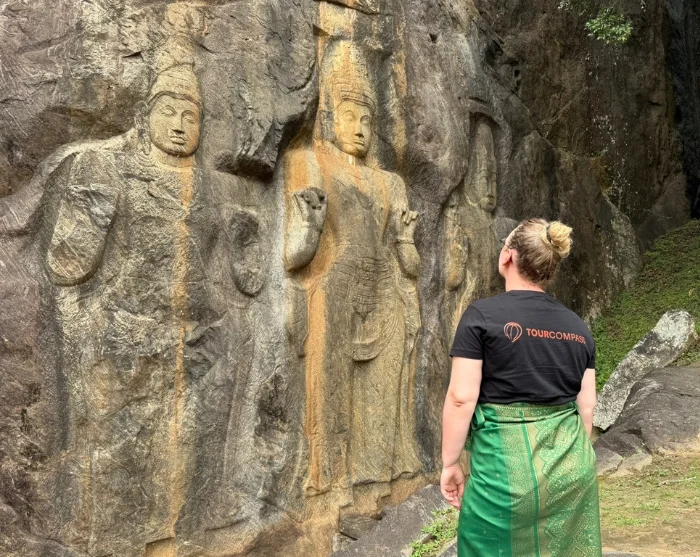 Seuraavaksi matka jatkuu Buduruwagala-temppeliin, joka on peräisin 900-luvulta. Temppeli sijaitsee rauhallisesti luonnon keskellä ja tunnetaan vaikuttavista kalliokaiverruksistaan. Temppelin 16-metrinen Buddhapatsas kohoaa majesteettisesti kuuden pienemmän hahmon ympäröimänä. Tarkemmin katsoessa voi yhä erottaa jälkiä niiden aikanaan kirkkaista väreistä. Se on kiehtova paikka, jossa menneisyys herää eloon.