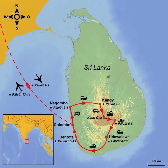 Perheenne seikkailu alkaa Negombon hienohiekkaisilta rannoilta, missä on hyvin aikaa sopeutua trooppiseen tunnelmaan. Täältä matka jatkuu kohti Kandya, ja matkalla pysähdytte paikallisen savenvalajan luona Kegallessa. Siellä pääsette itse kokeilemaan savenvalantaa ja luomaan omat pienet mestariteoksenne muistoksi matkasta. Kandyyn saavuttuanne pääsette nauttimaan perinteisestä srilankalaisesta tanssiesityksestä – värikkäät puvut, rytmikkäät liikkeet ja tuli lumoavat katsojat niin lapsista aikuisiin.