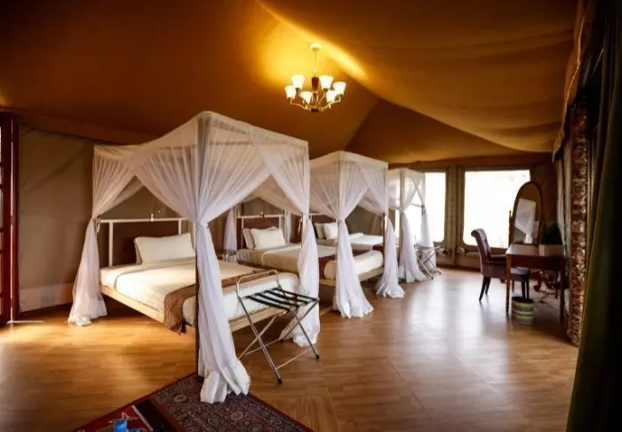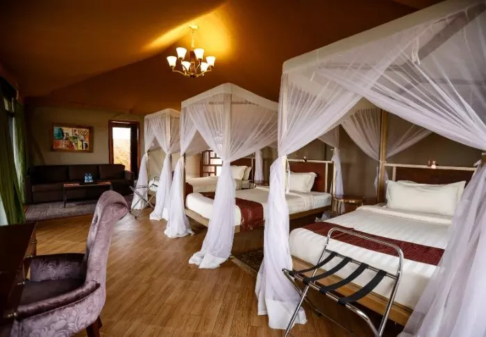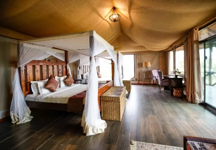 Teltat ovat suuria ja kahden king size -sängyn ympärillä on runsaasti tilaa. Olohuoneesta voit astua suoraan suurelle verannalle, josta on uskomattoman upeat näkymät yli Serengetin tasankojen. Kaikissa teltoissa on oma kylpyhuone, jossa on suihku ja WC. Kylpyhuoneessa on myös amme, jossa voit rentoutua kansallispuiston maisemia ihaillen. Lisäksi käytettävissäsi ovat yksityiset ulkoilmasuihkut, jotka tarjoavat myös fantastisen näköalan Serengetille.