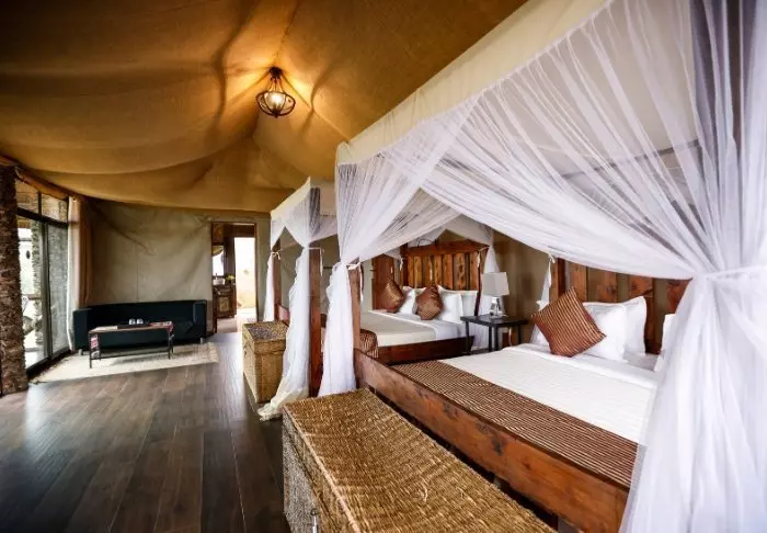 Lodge koostuu 20 yksittäisestä luksusteltasta, jotka on rakennettu kankaasta ja kivestä. Tilavien telttojen sivut ovat kangasta, joten ne antavat sinun aistia luonnon äänet ja tuoksut ja pääset kokemaan todellista vanhan ajan safaritunnelmaa. Olkikatot ja osittain kivestä rakennetut seinät saavat teltat tuntumaan enemmän huonemaisilta. Ylelliset teltat lepäävät korkealla kivipilareiden päällä, mikä antaa ilman virrata vapaasti teltan ympärillä ja tekee teltastasi myös ainutlaatuisen hienon näköalapaikan.