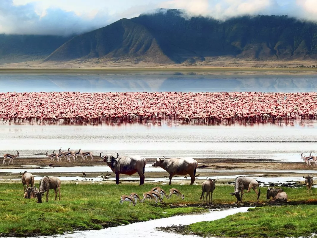 Kraatterin reunalta tie kiemurtelee 600 metriä alas pitkin sammuneen tulivuoren jättämän valtavan kuopan laitaa aina 260 km²:n kokoiselle, vehreälle pohjalle. Kraatterin pohjalta löytyy niin savanneja, soita, järviä ja pieniä jokia kuin akaasiametsiä ja jopa suuri suolajärvi. Sitä pitää kotinaan peräti 25 000–30 000 eläinyksilöä. Kraatterin pohjaa pitkin ajaessa voi tuntea olevansa kuin retkellä ”Jurassic Parkissa”, sillä kaikkialla vilisee eläimiä. Tällä suhteellisen pienellä alueella elää useita leijonaperheitä, suuria puhvelilaumoja, flamingoja ja jopa uhanalaisia pensassarvikuonoja. Ainoa eläin, jota et voi täällä tavata, on kirahvi, sillä ne eivät koskaan ole löytäneet tietään Serengetistä Ngorongoron kraatteriin asti.