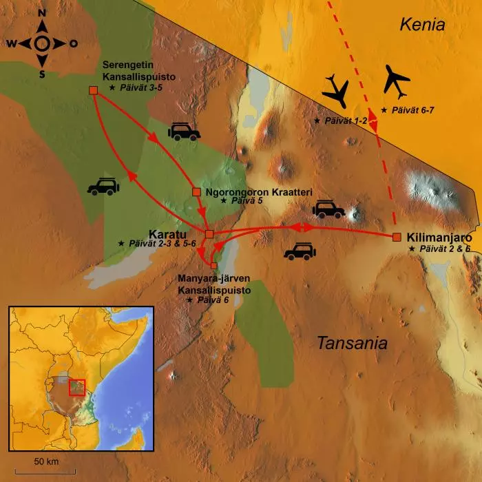Ensimmäisenä päivänä on edessä lento valitulta lentokentältä Tansaniaan. Matkan varrella on välilaskuja.