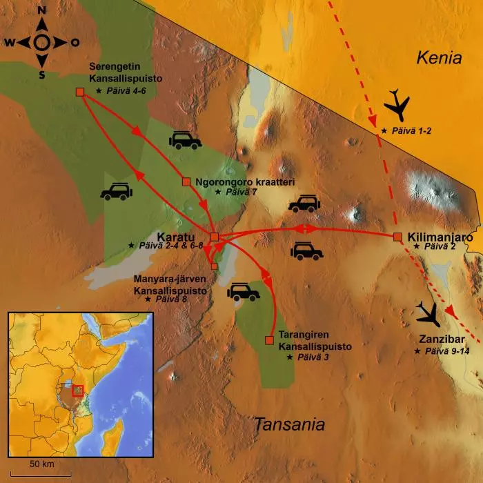 | Päivä 8 | Manyara-järvi n. 25 km – Kilimanjaron lentokenttä n. 170 km | 195 |