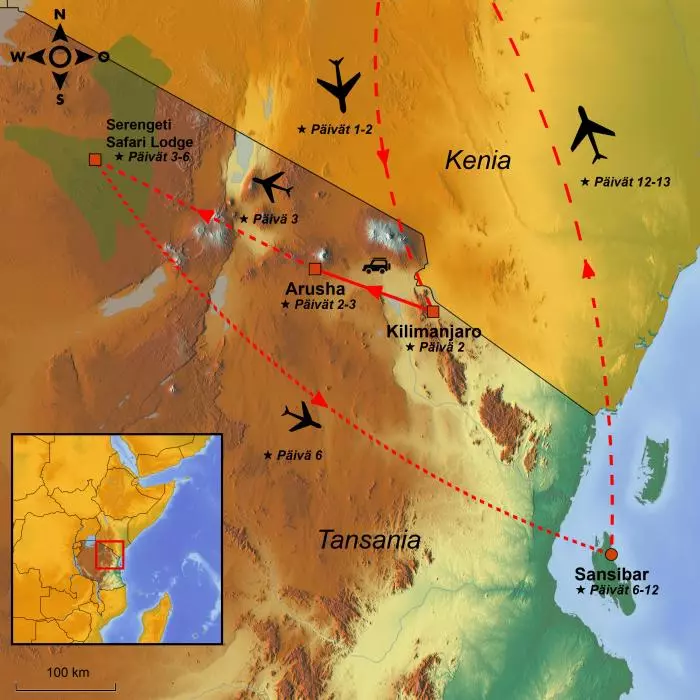 Ensimmäisenä päivänä on edessä lento Suomesta Tansaniaan. Matkan varrella on välilaskuja.