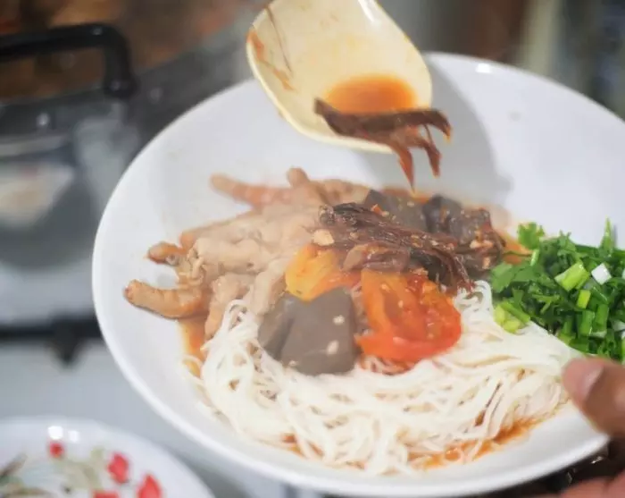 Alkaako vatsa kurnia? Kierros jatkuu ensimmäiselle ruokapysäkille, jossa maistetaan khanom chiniä eli tuoretta, ohutta riisinuudelia, joka on yksi Etelä-Thaimaan erikoisuuksista. Paikalliset syövät tätä ruokalajia tavallisesti oman makunsa mukaisen currytahnan kanssa. Päälle kasataan keko tuoreita mausteyrttejä ja vihanneksia. Voit itse päättää, millaisia lisukkeita käytät ja kuinka tulisen annoksen haluat.