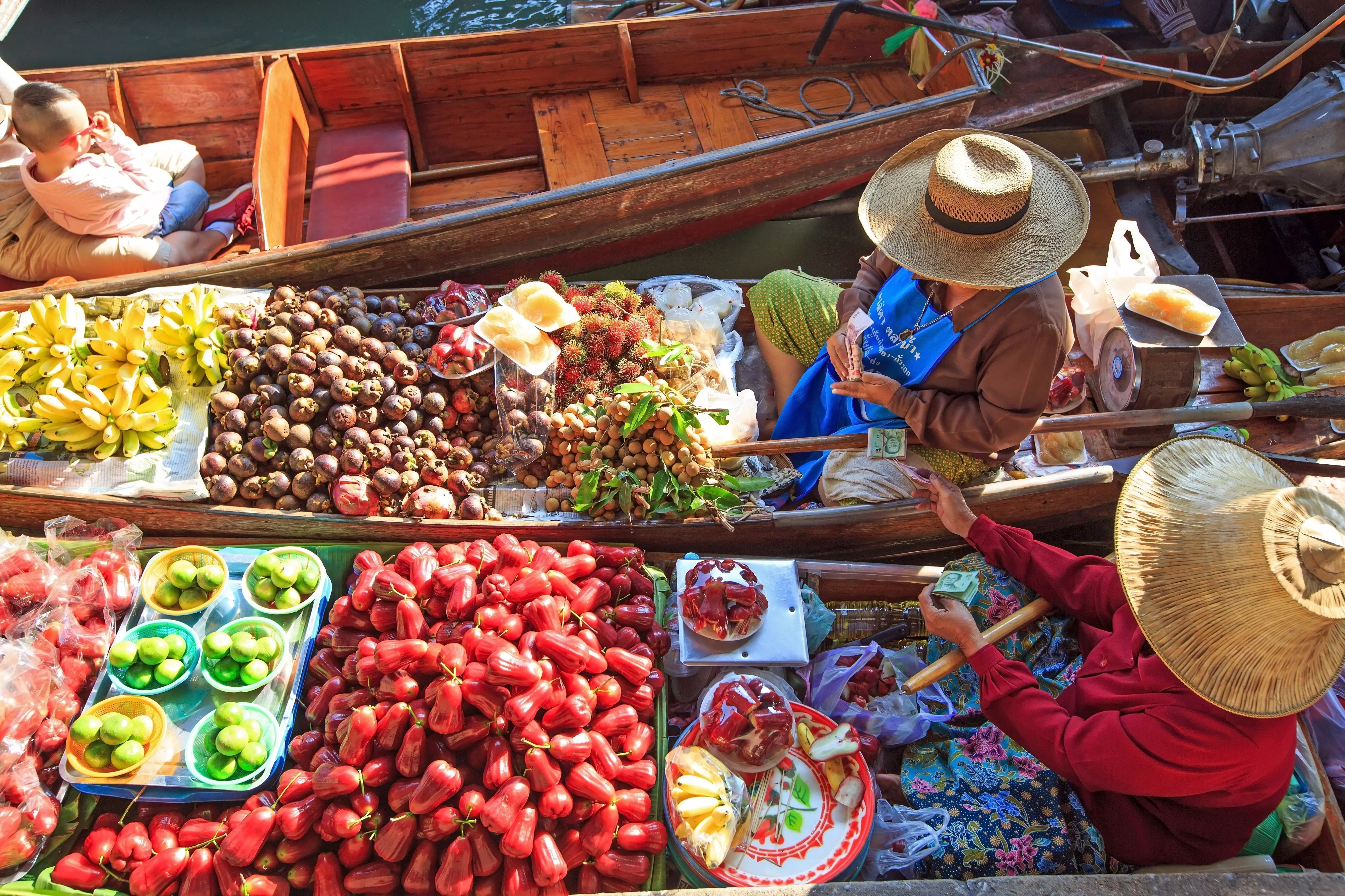 Kun saavutte torille, perinteinen pitkähäntävene kuljettaa sinut sen kanavien halki. Purjehditte paaluille rakennettujen puutalojen ohi varsinaiselle Damnoen Saduak -torille. Kanaalien rannoille on pystytetty puisia kojuja, joissa myydään matkamuistoja ja maalauksia, ja myyjät purjehtivat ympäri toria myyden veneistään kaikkea kukista värikkäisiin hedelmiin ja kookosjäätelöön. Tunnelma on samalla kaoottinen ja viehättävä. Ehkä teet myös löytöjä!