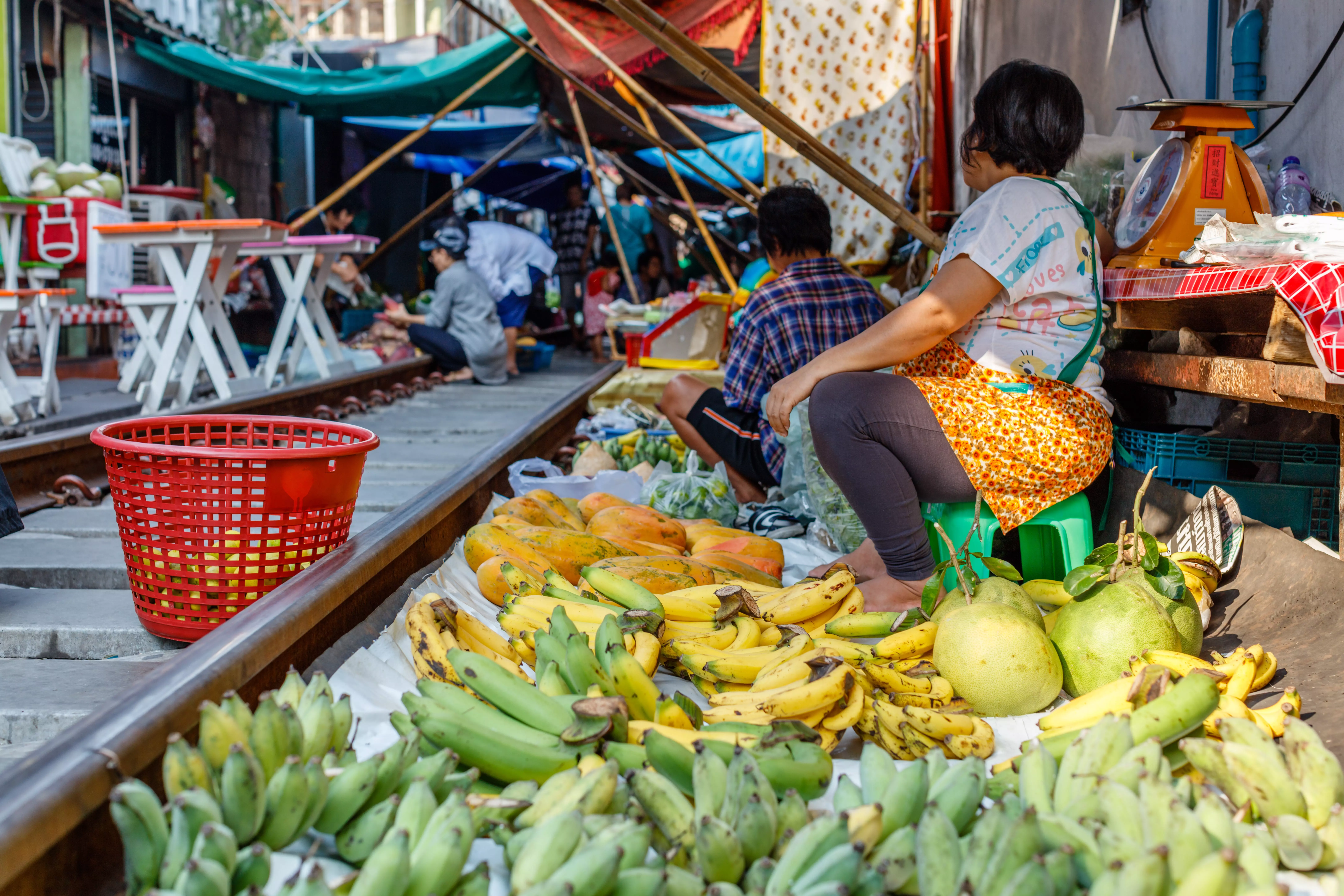 Hieman yli tunnin ajomatkan jälkeen saavutte Maeklongiin, jossa pääset tutustumaan vilkkaaseen torielämään, jossa monenlaiset tuotteet, kuten tuoreet hedelmät, vihannekset, mausteet, liha, kala ja matkamuistot vaihtavat omistajaa. Torin erikoisin piirre on se, että se levittäytyy osaksi rautatien poikki. Junan lähestyessä torikansa ohjataan punaisten viivojen taakse. On hauska nähdä, kuinka torimyyjät taittavat markiisinsa ja kojunsa näppärästi pois junan tieltä ja pystyttävät ne tuossa tuokiossa uudelleen. Jos aika riittää, kävelette Maeklongin pääteasemalle, josta juna lähtee takaisin tulosuuntaansa. Lyhyen matkan päässä rautatieasemalta on pieniä viehättäviä kojuja, joille turistit eivät eksy ja joista voit ostaa jääkahvia, thaimaalaista teetä tai perinteistä thaimaalaista khanom krok -jälkiruokaa.