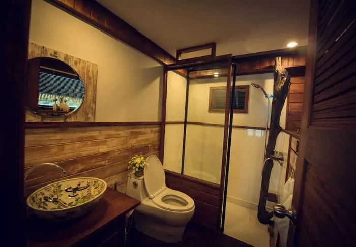 Lomakeskus on rakennettu kauniista tummasta puusta, jota on käytetty myös sisustuksessa, ja se huokuu pohjoisthaimaalaista charmia.