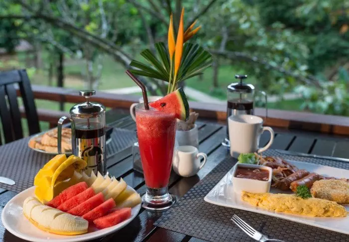 Resortin ravintolassa tarjoillaan luomuruokaa, joka tuotetaan mahdollisuuksien mukaan itse.