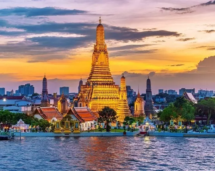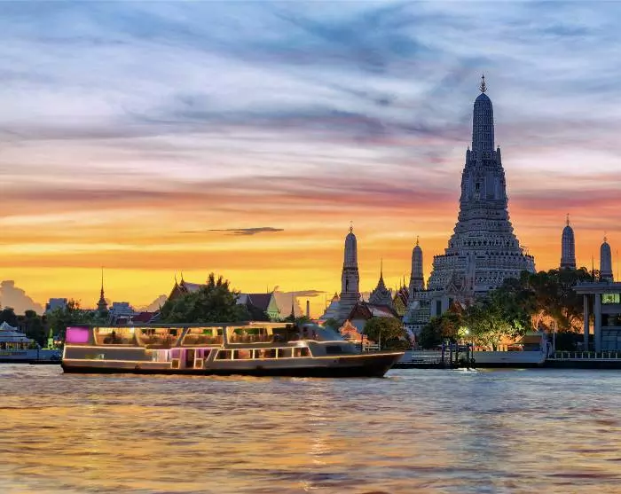 Ilta huipentuu tunnelmalliseen ajeluun ohi Grand Palacen ja City Pillarn, ennen kuin saavut Chao Phraya-joen rannalle. Vastarannalla kohoaa kauniisti valaistu Wat Arun, joka muodostaa upean näkymän.